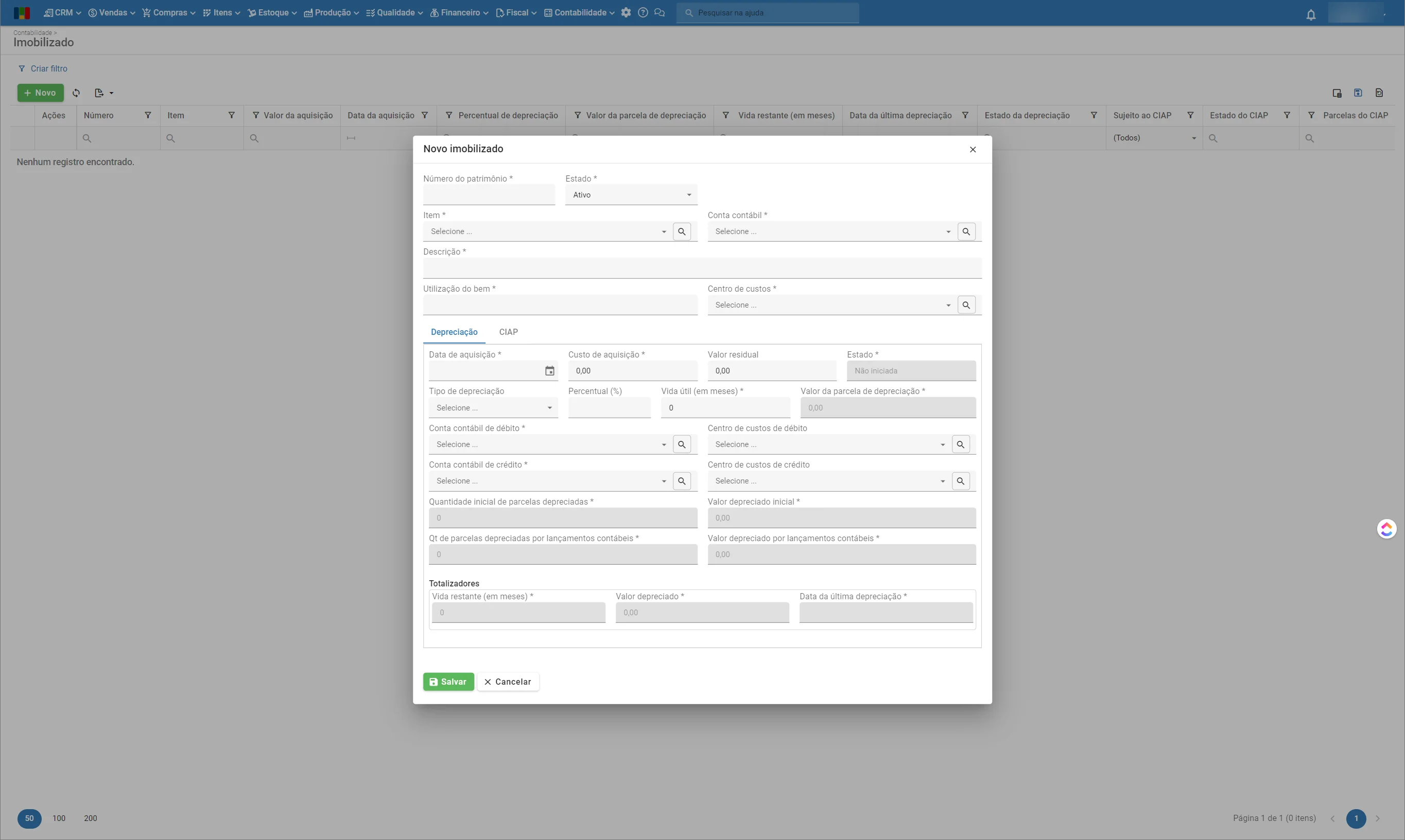 - Valor depreciado inicial: valor total já depreciado até o momento de cadastro do imobilizado. Só pode ser editado antes do primeiro lançamento contábil de depreciação.