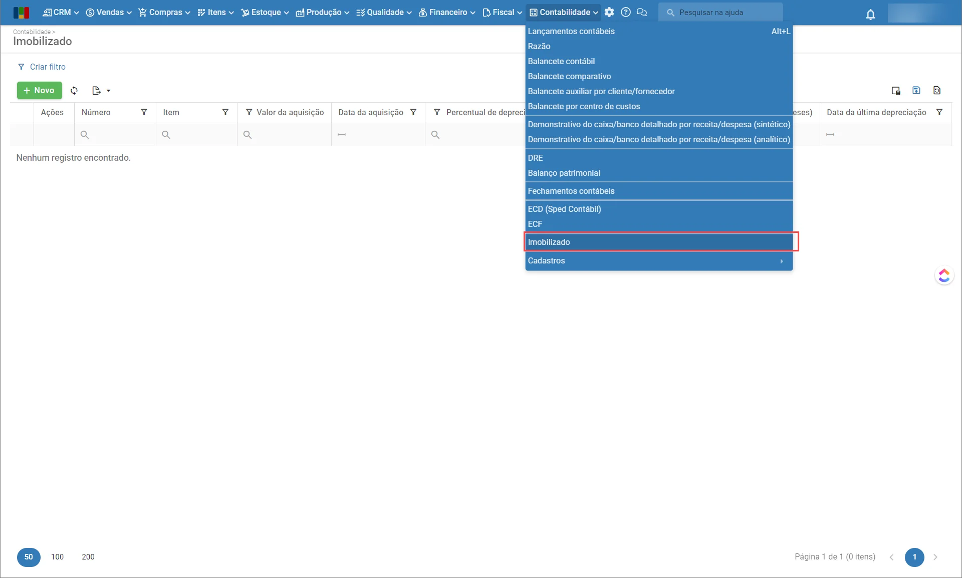 1) Para cadastrar ativos imobilizados, acesse o menu “Contabilidade > Imobilizado”.