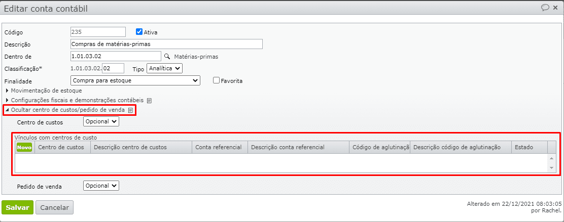 1.1.2 Encontre a conta contábil, abra sua edição e expanda a seção “Centro de custos/pedido de venda”: