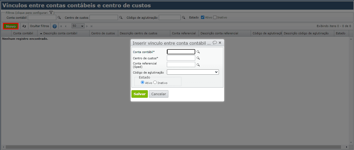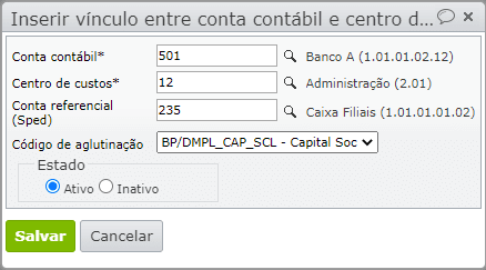 - Informe a conta contábil e o centro de custos e, a seguir, insira a conta referencial e/ou o código de aglutinação que devem ser usados. Exemplo: