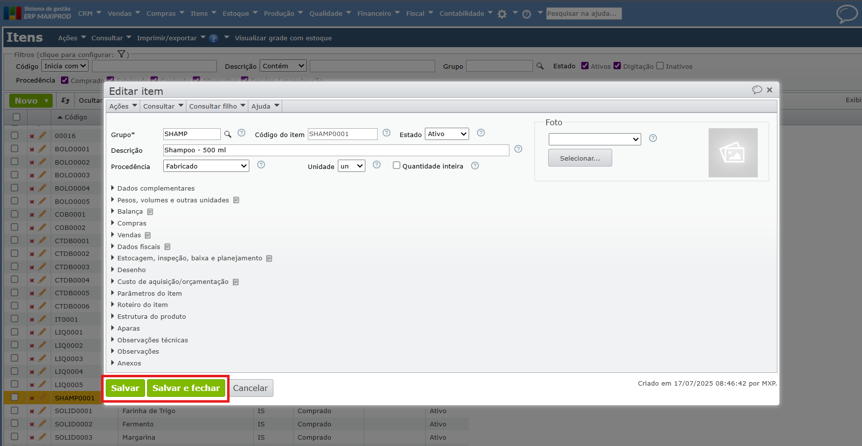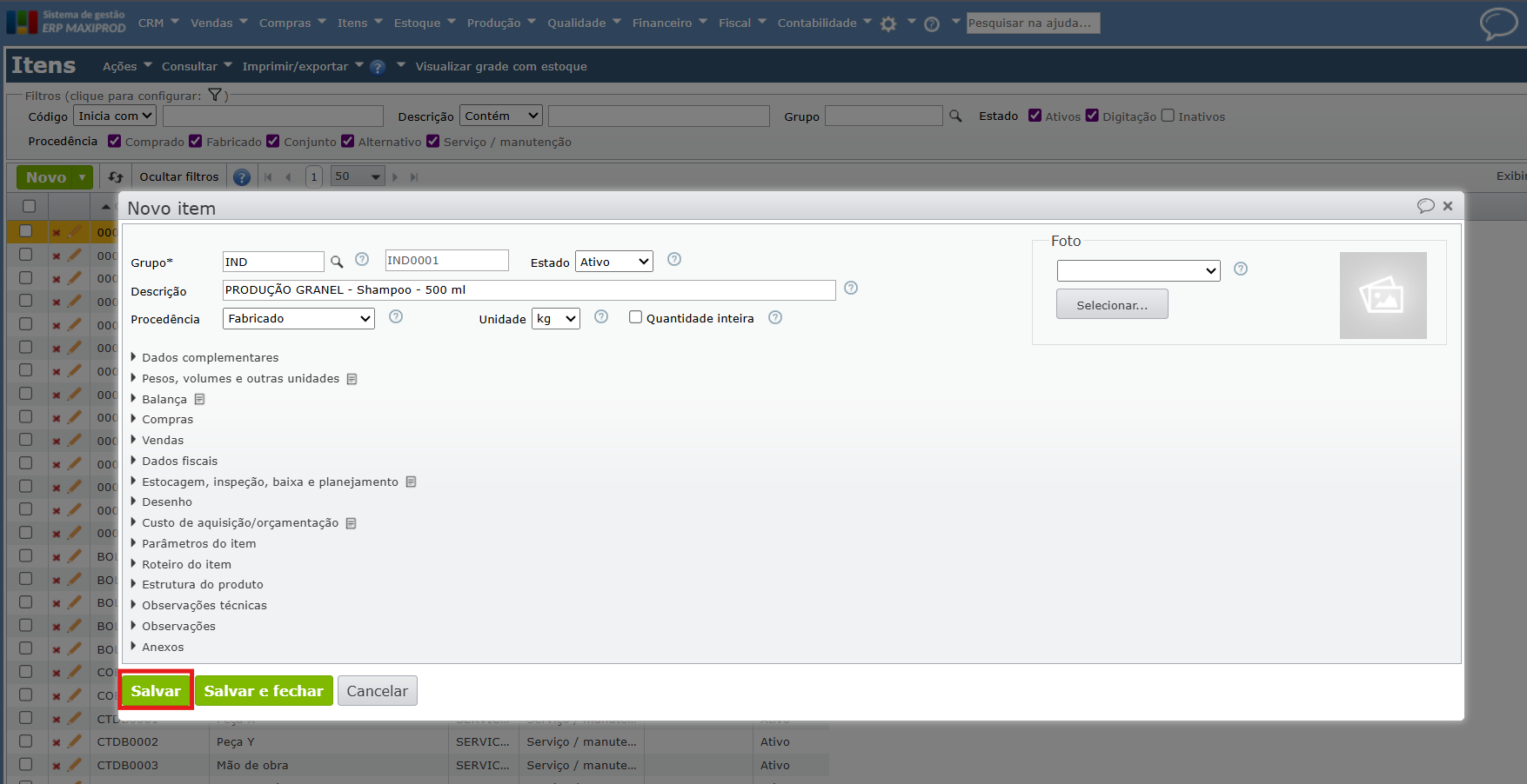 3) Preencha o cadastro do item e clique no botão verde “Salvar” ou “Salvar e fechar” para gravar o item no sistema.