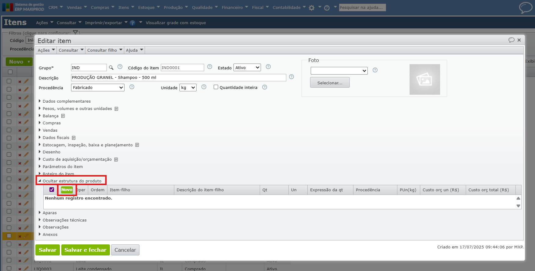 4) Crie o subproduto em granel (base da fórmula) que representa a mistura utilizada na produção do produto final (ex: PRODUÇÃO GRANEL – Shampoo – 500ml), e clique no botão verde “Salvar” para gravar o item no sistema.
