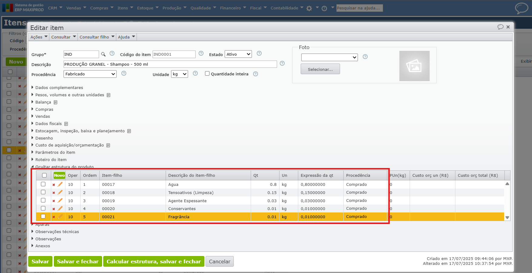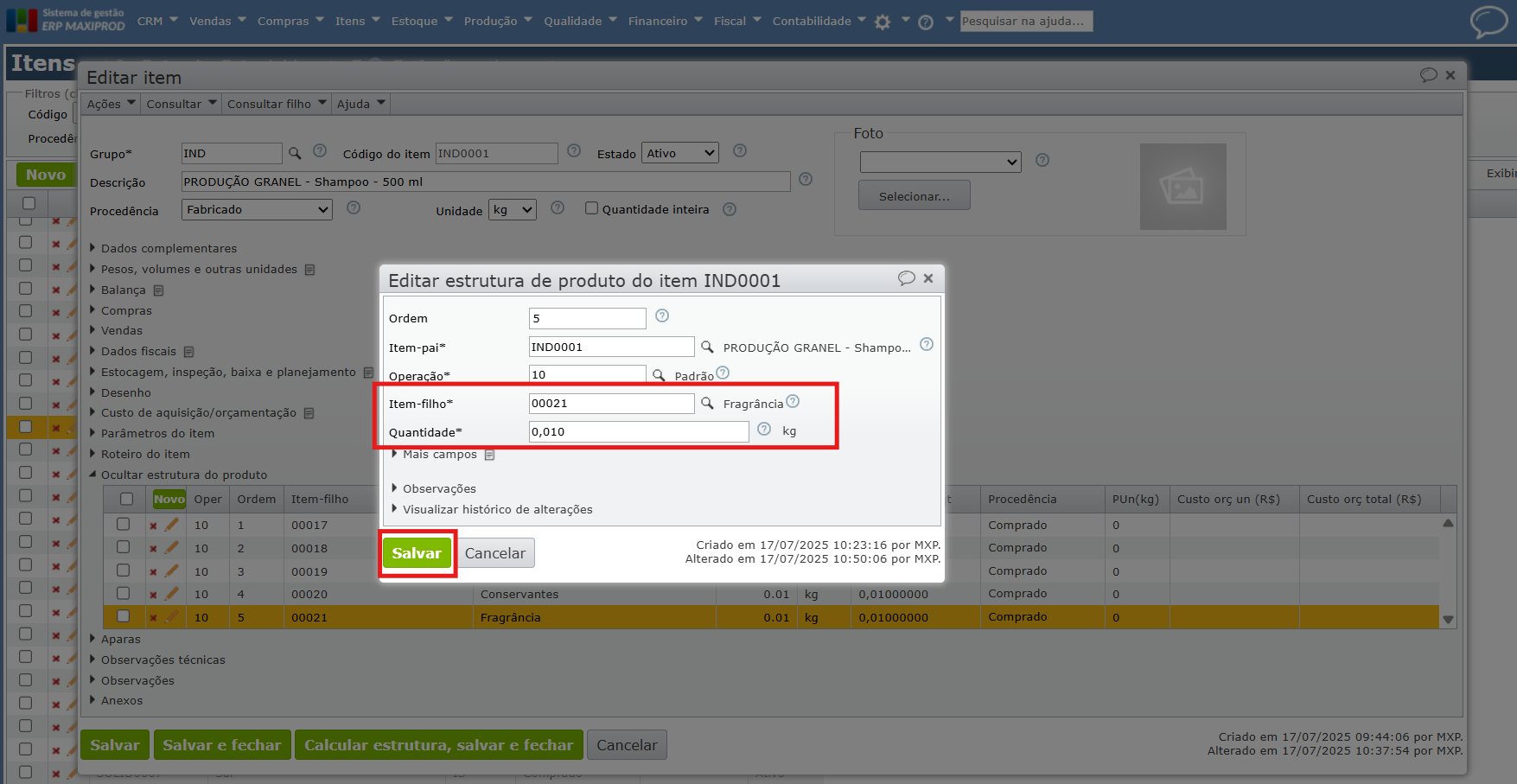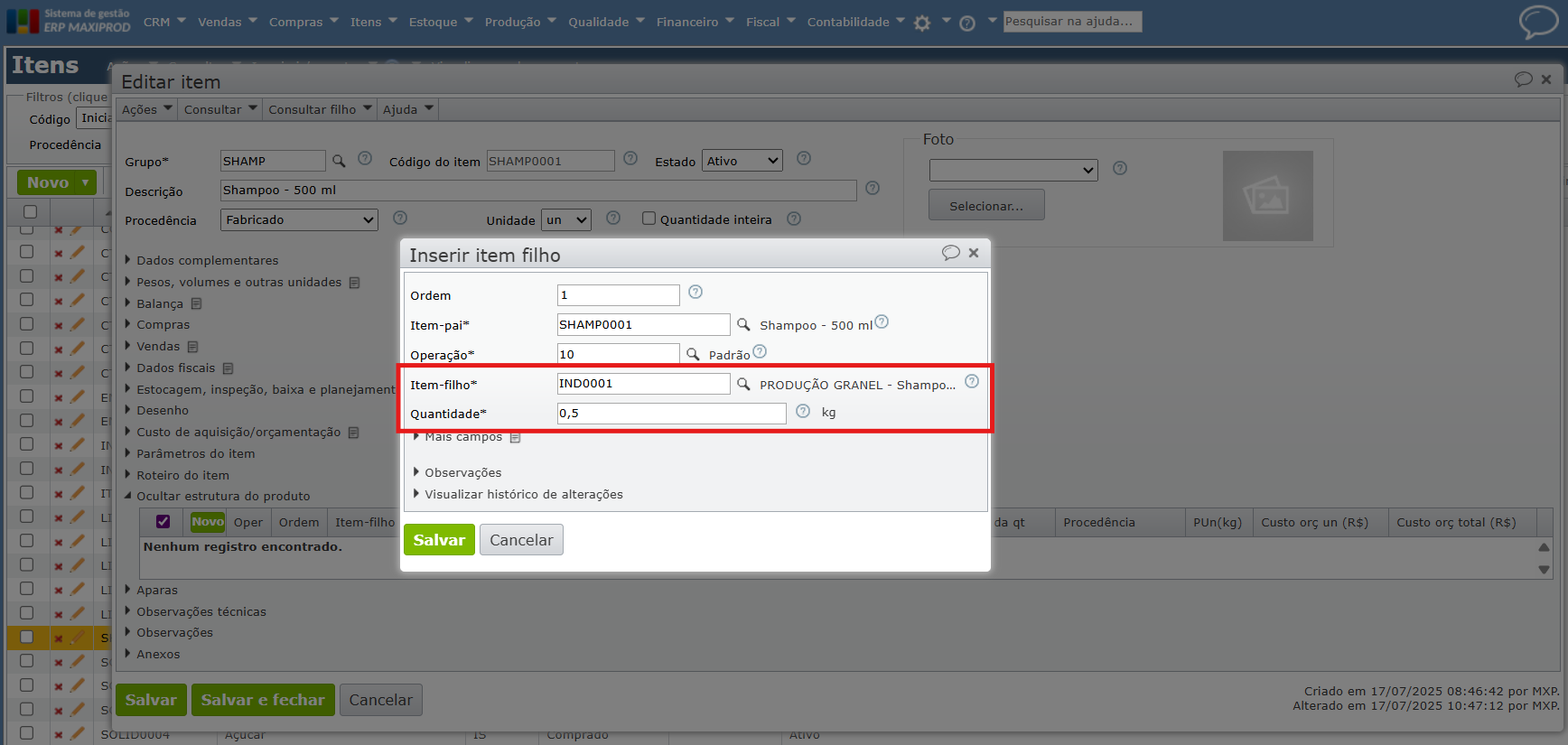 6) Na estrutura do item por granel, insira cada componente com sua quantidade por unidade de medida do produto (ex: 1 kg de granel do shampoo). Consideraremos que 1 litro de shampoo granel pesa 1kg (densidade = 1kg/L). Na inserção do item-filho, indique o insumo e a quantidade. Para gravar os dados na estrutura, clique no botão verde “Salvar”.