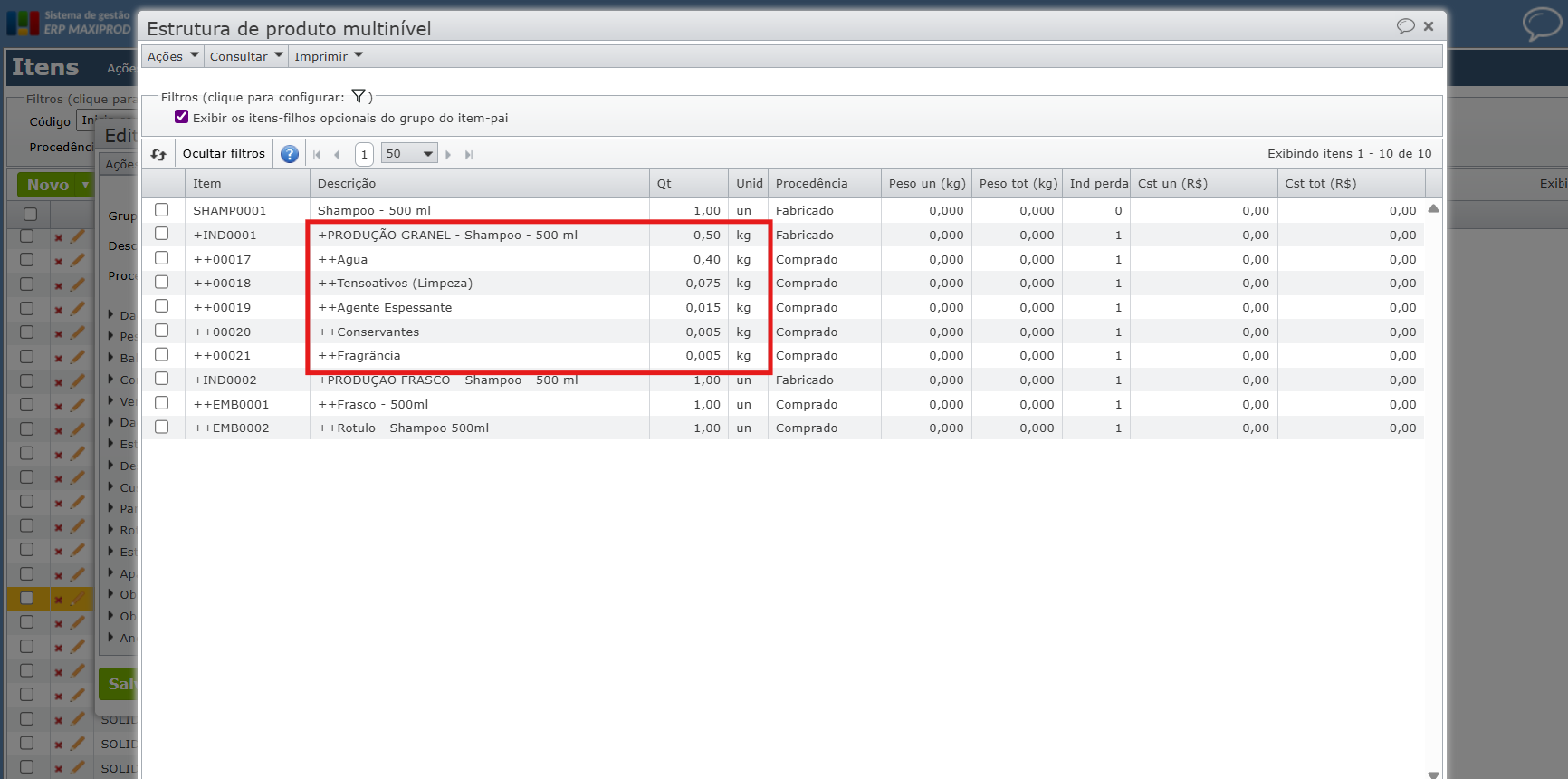 b) Ao verificar a estrutura multinível do produto, verifica-se que o sistema calculou as quantidades com base na estrutura que criamos para 1 kg de granel. Ou seja, a quantidade do item a granel na estrutura de produto do item final será multiplicada pelas quantidades dos seus insumos na sua estrutura.