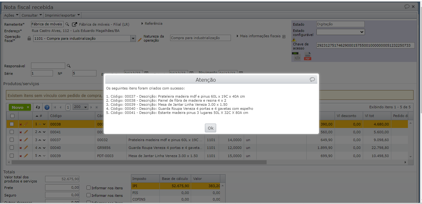 4) Ao final do processo, será exibida uma mensagem, listando os itens que foram cadastrados com sucesso.