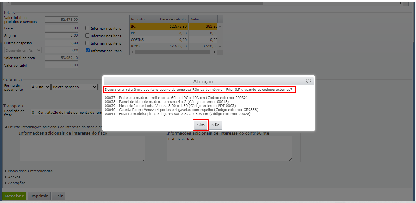 5) No recebimento da NF, o sistema mostrará mensagem de “Atenção” permitindo a criação de referência entre os códigos internos e os itens da empresa fornecedora, por meio dos códigos externos. Clique em “Sim” para criar a referência. Para mais informações, clique aqui.