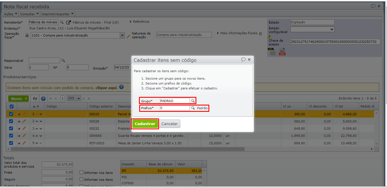 Ao importar o XML de uma nota fiscal (NF) com itens ainda não cadastrados, estes aparecem sem código, como mostra a imagem. No entanto, esses itens podem ser cadastrados diretamente a partir da NF recebida.