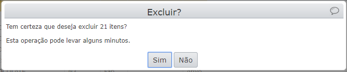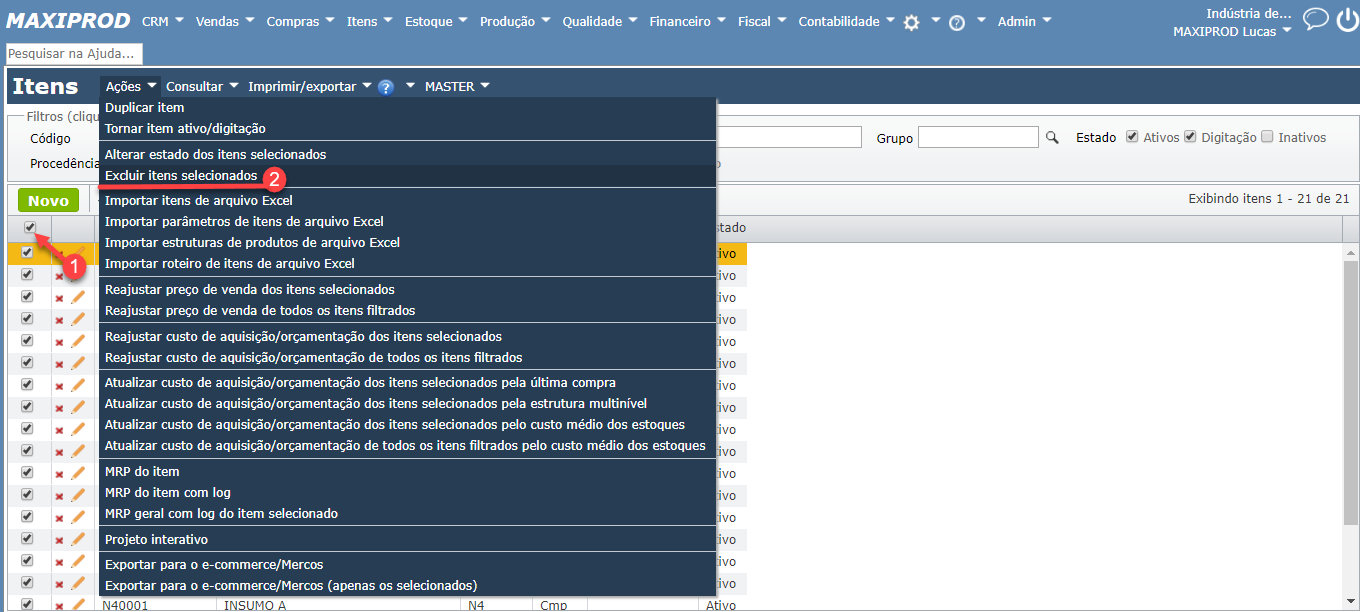 2) Na grade de Itens, selecione os checkboxes dos itens que deseja excluir. Para excluir todos os itens de um grupo, pode-se preencher o filtro “Grupo”, e marcar o checkbox inicial da grade, marcando todos os registros filtrados.