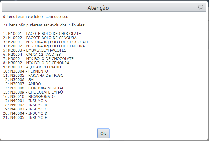 6) Ao final do processo, é exibida a lista das exclusões. Somente é possível excluir itens que não tenham sido utilizados, ou seja, que não tenham movimentações, incluídos em notas fiscais, pedidos de venda, tabelas de preços, etc.