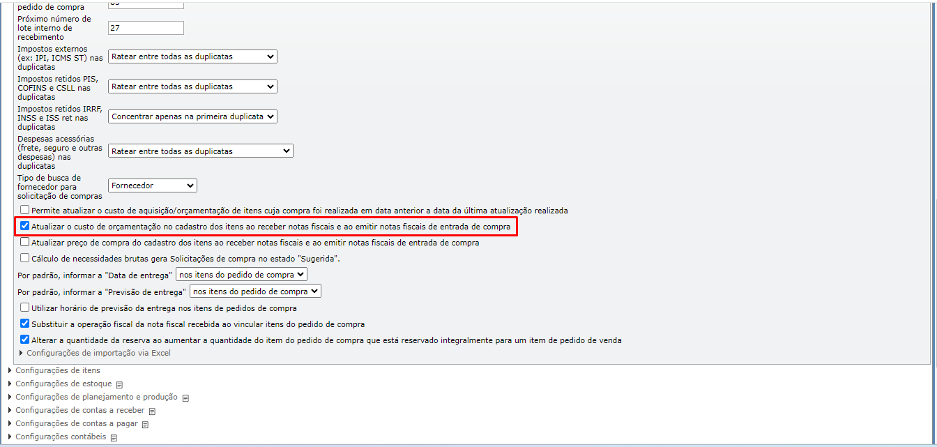 5) Para atualizar automaticamente o custo orçado de um item a cada compra, o item e a operação fiscal do item da NF devem atender algumas condições: