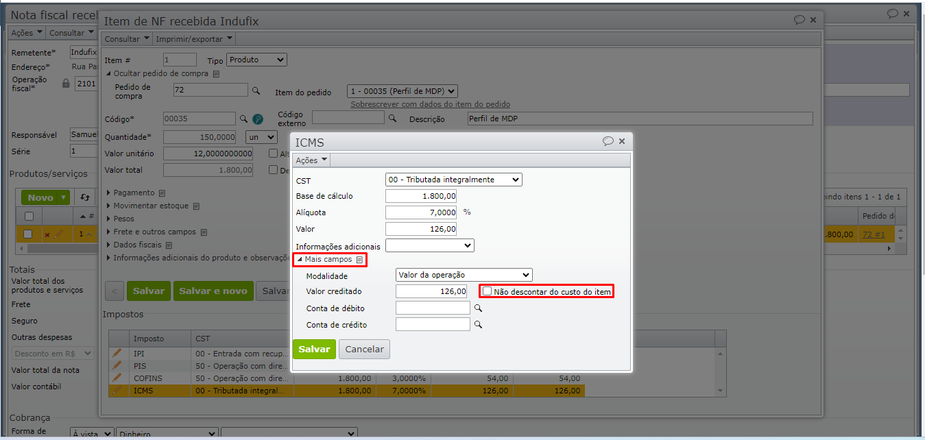 4) Para que o sistema não desconte o crédito dos impostos do custo do item, o usuário deve marcar o campo “Não descontar do custo do item”, na configuração do imposto na operação fiscal ou no item da nota fiscal recebida. Como exemplo, pode ser usado para prever o estorno de crédito de ICMS nos casos em que a empresa não pode aproveitar o crédito do imposto.