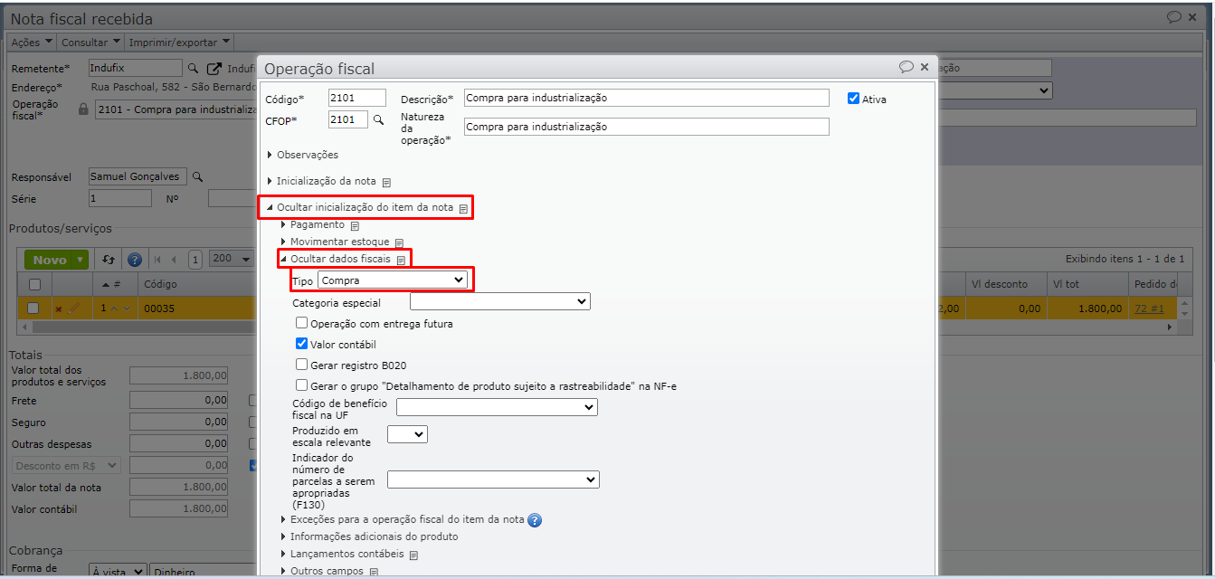 a) A operação fiscal do item deve ser do tipo “Compra”.