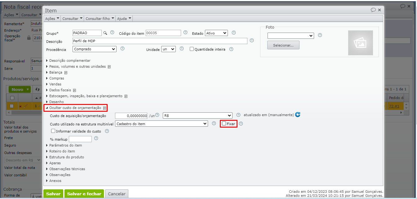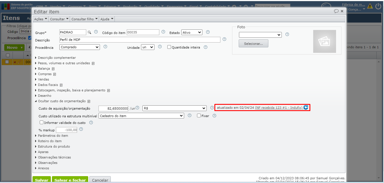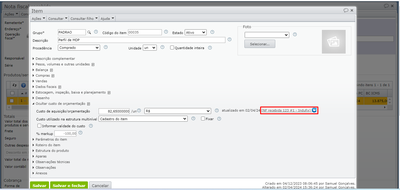 6) A NF que atualizou o custo de orçamentação para seu valor atual é identificada na seção de custo para orçamentação da tela de edição do item. Clicando nesta informação, a tela de edição da nota fiscal é aberta.