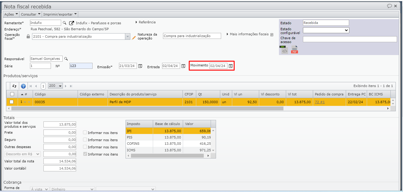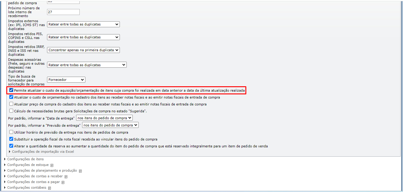 c) A data de movimento da NF deve ser igual ou posterior à última atualização do custo orçado do item, exceto se a opção “Permite atualizar o custo de aquisição/orçamentação de itens cuja compra foi realizada em data anterior a data da última atualização realizada” estiver marcada nas configurações de compra.