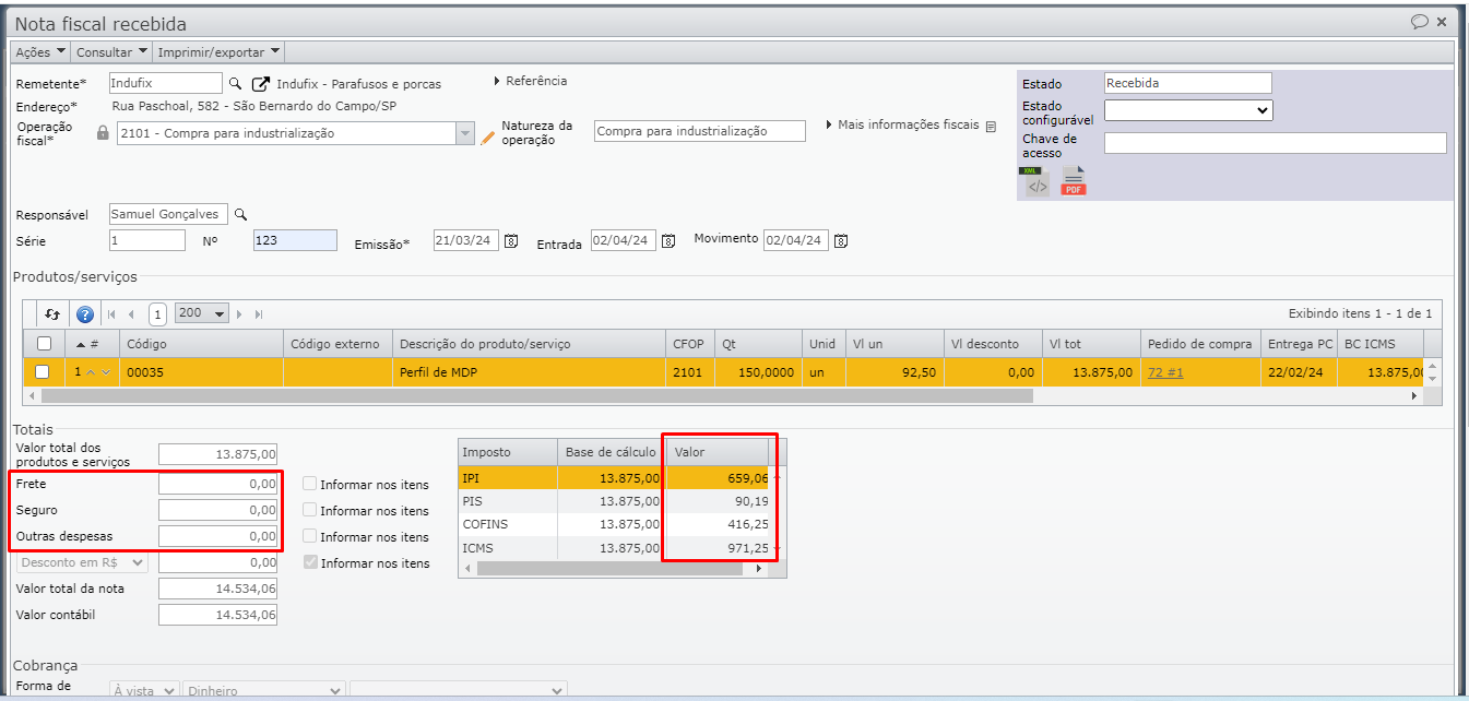 3) O custo orçado, quando atualizado pelas NFs de entrada, inclui frete, seguro e outras despesas da NF, descontando os créditos de impostos.