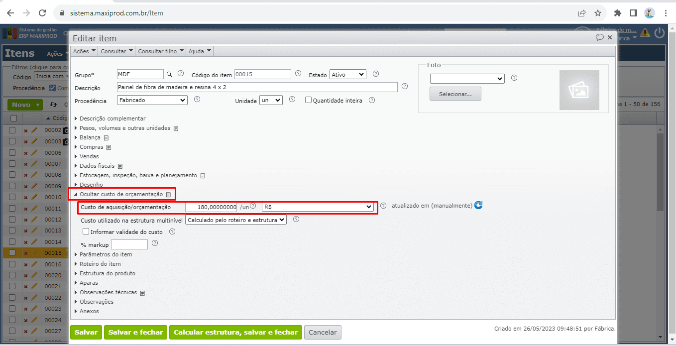 3) Na janela de cadastro do item, expanda a seção “Custo de aquisição/orçamentação” e observe o campo “Custo de aquisição/orçamentação”.
