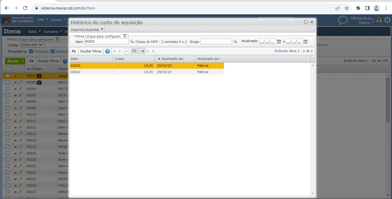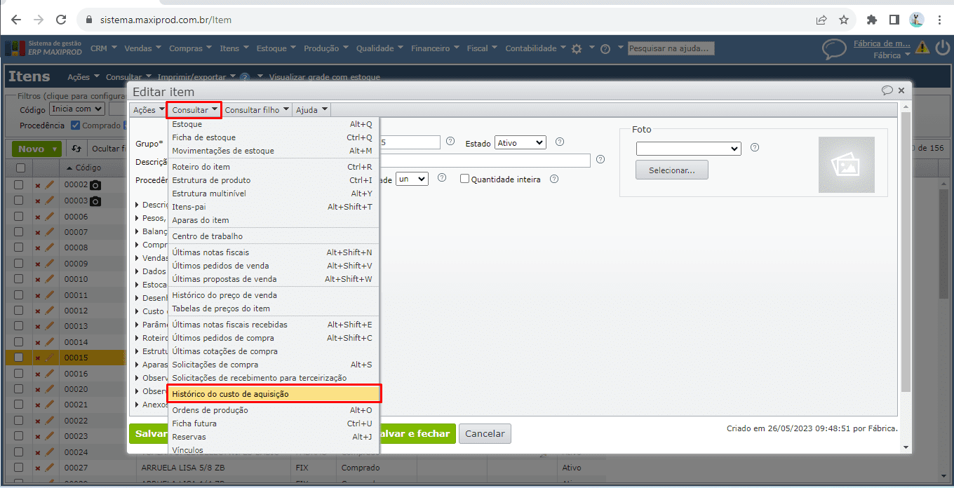 4) É guardado o histórico dos custos de aquisição de cada item. Para consultá-lo a partir da tela de edição do item, vá para “Consultar > Histórico do custo de aquisição”.