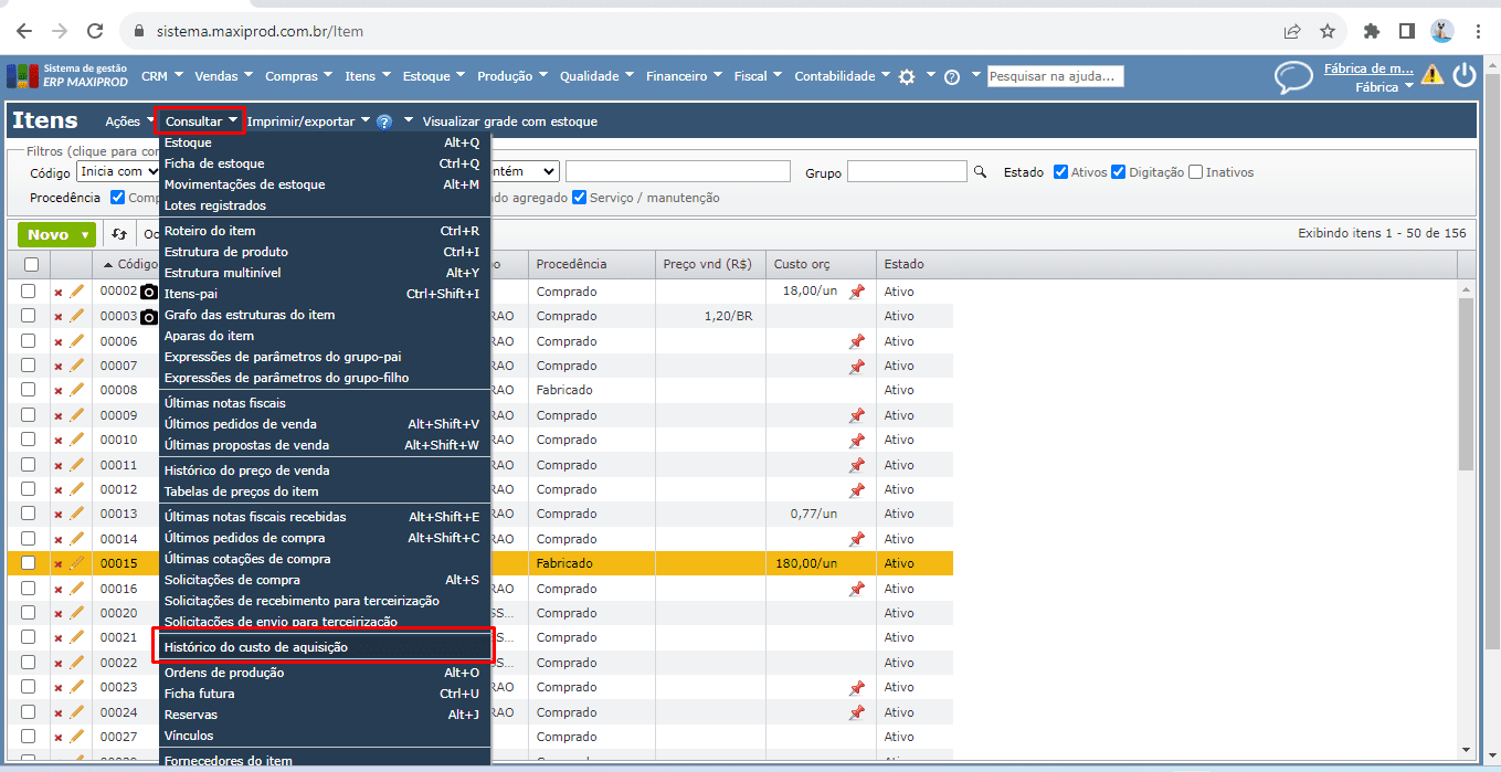 5) Esta tabela, com o histórico do custo de aquisição, também pode ser acessada pela grade de itens. Selecione o item e vá para “Consultar > Histórico do custo de aquisição”.