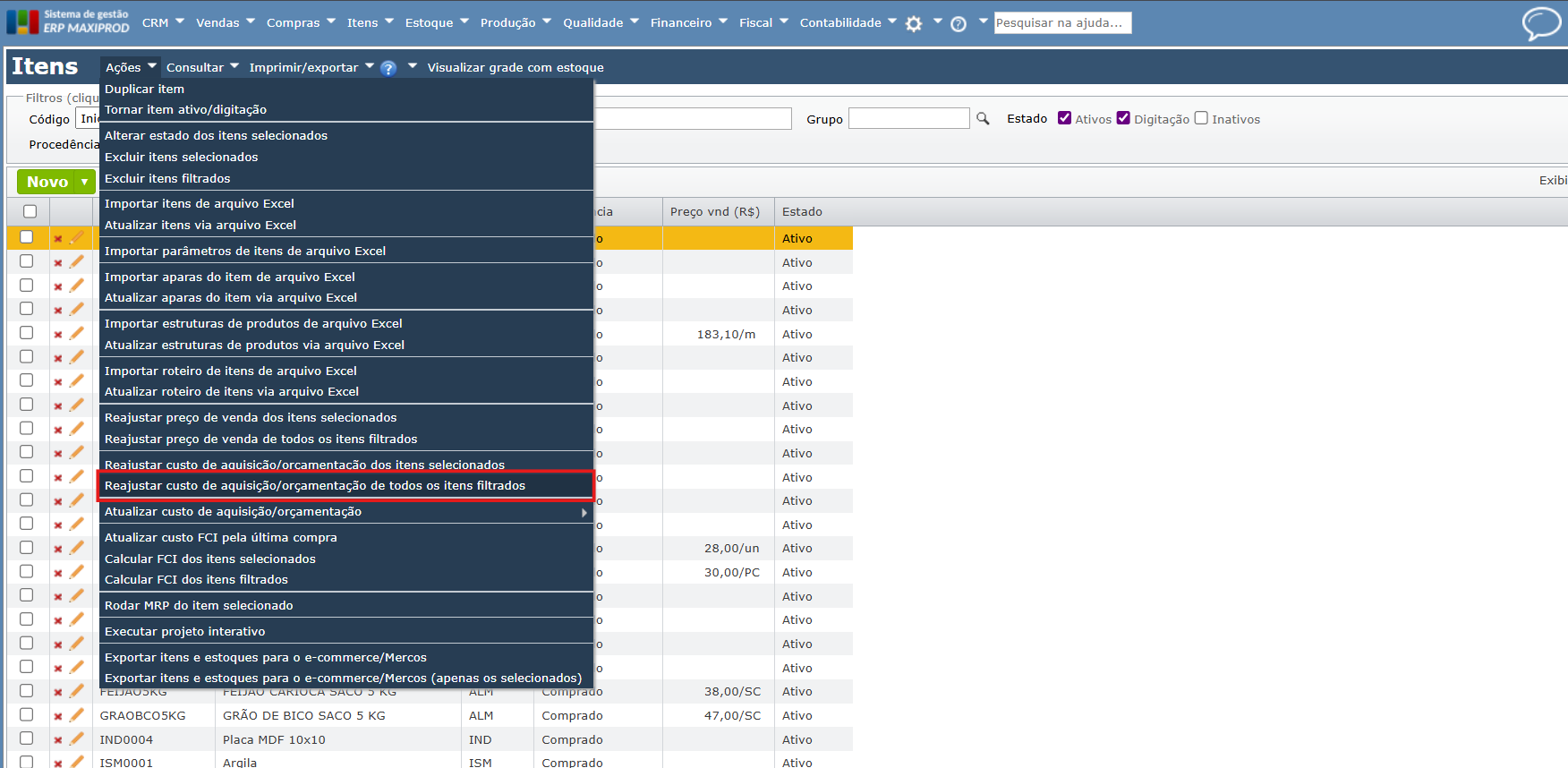 1) Na tela de Itens, vá ao menu “Ações > Atualizar custo de aquisição/orçamentação”.