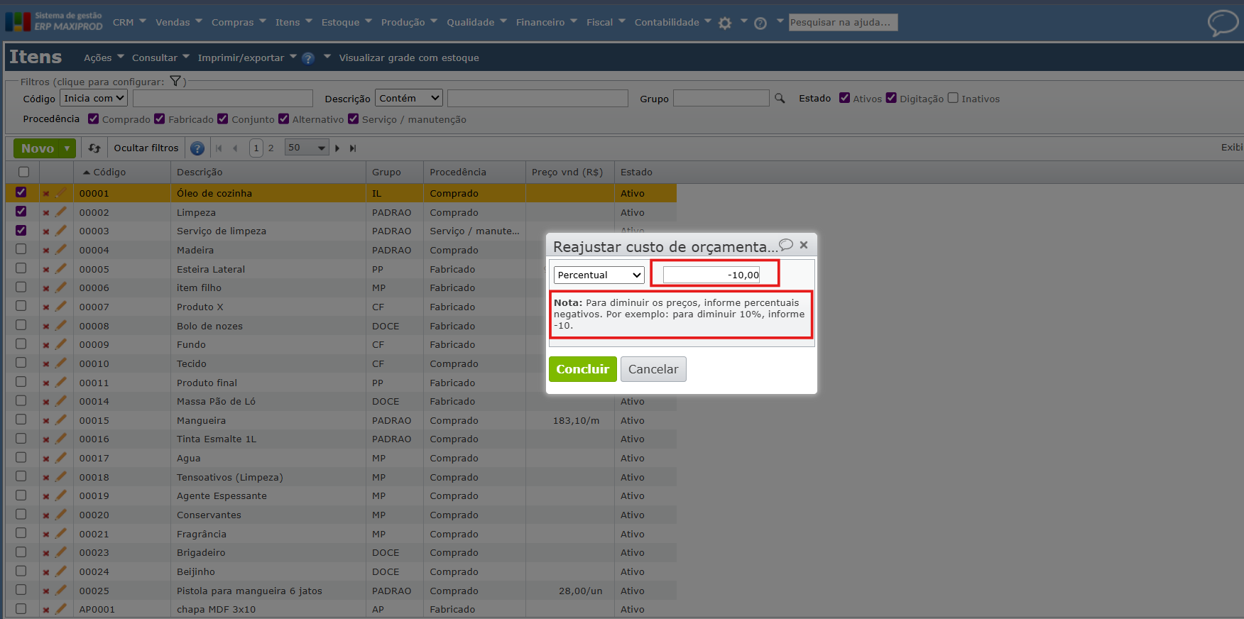 b) Na segunda opção, “Reajustar custo de aquisição de todos os itens filtrados”, todos os itens exibidos terão seus custos de aquisição atualizados. Certifique-se de que apenas os itens desejados estão filtrados em tela.