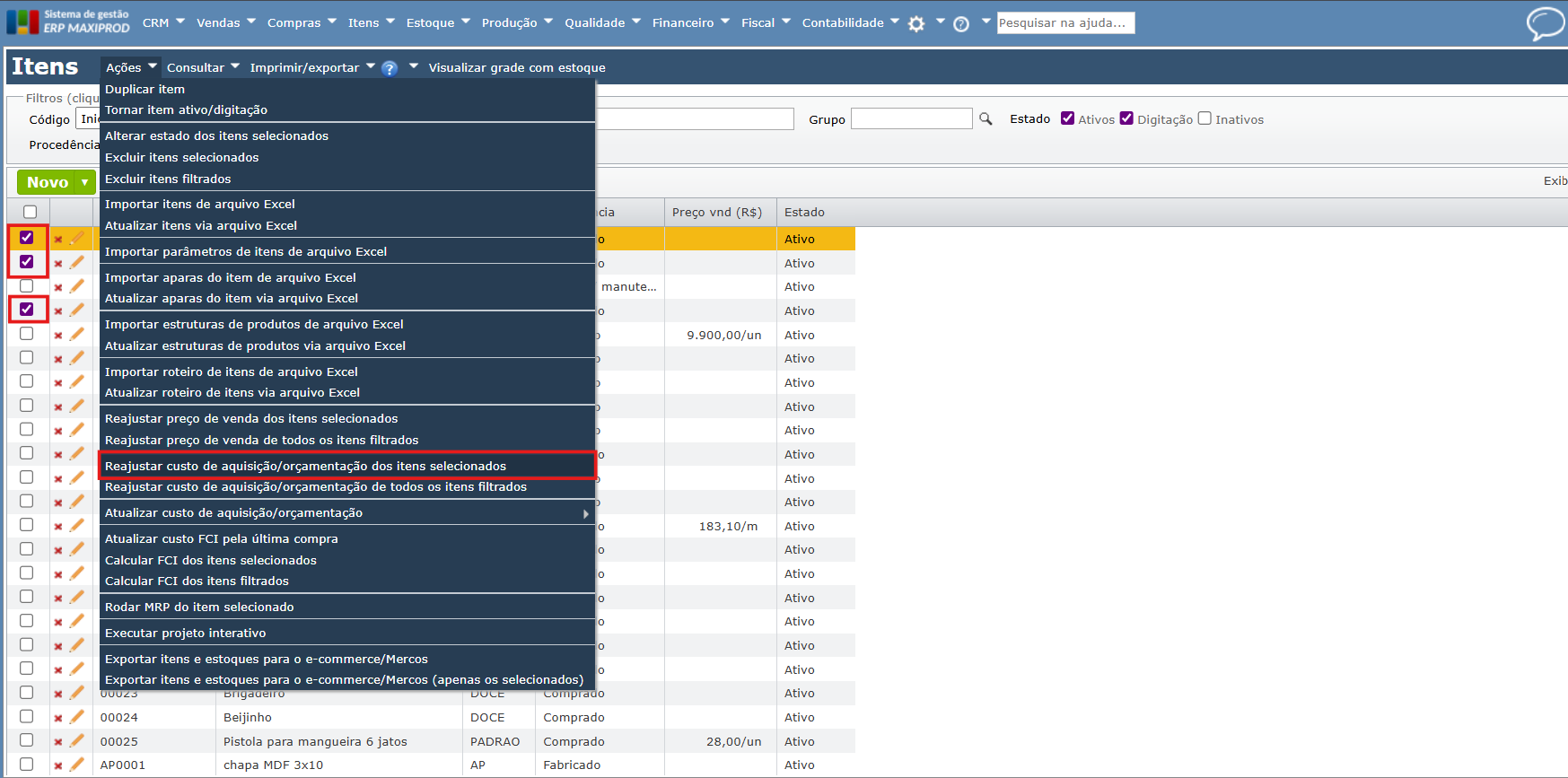 1) Na tela de itens, vá ao menu “Ações > Reajustar custo de aquisição dos itens selecionados” ou “Reajustar custo de aquisição de todos os itens filtrados”.