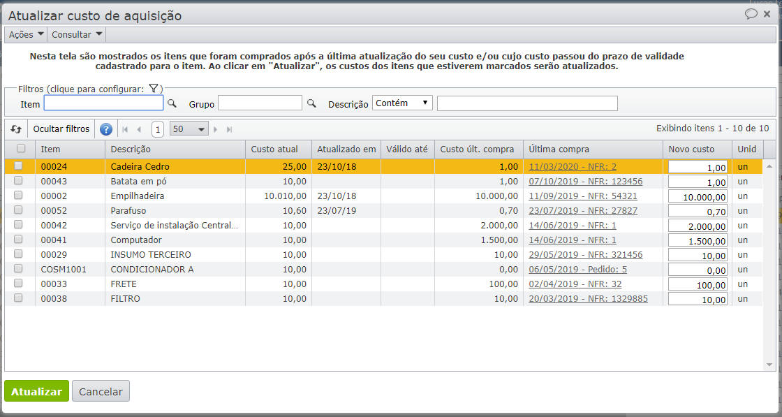 - Por que não estou encontrando um item na opção “Atualizar custo de aquisição/orçamentação dos itens selecionados pela última compra”?