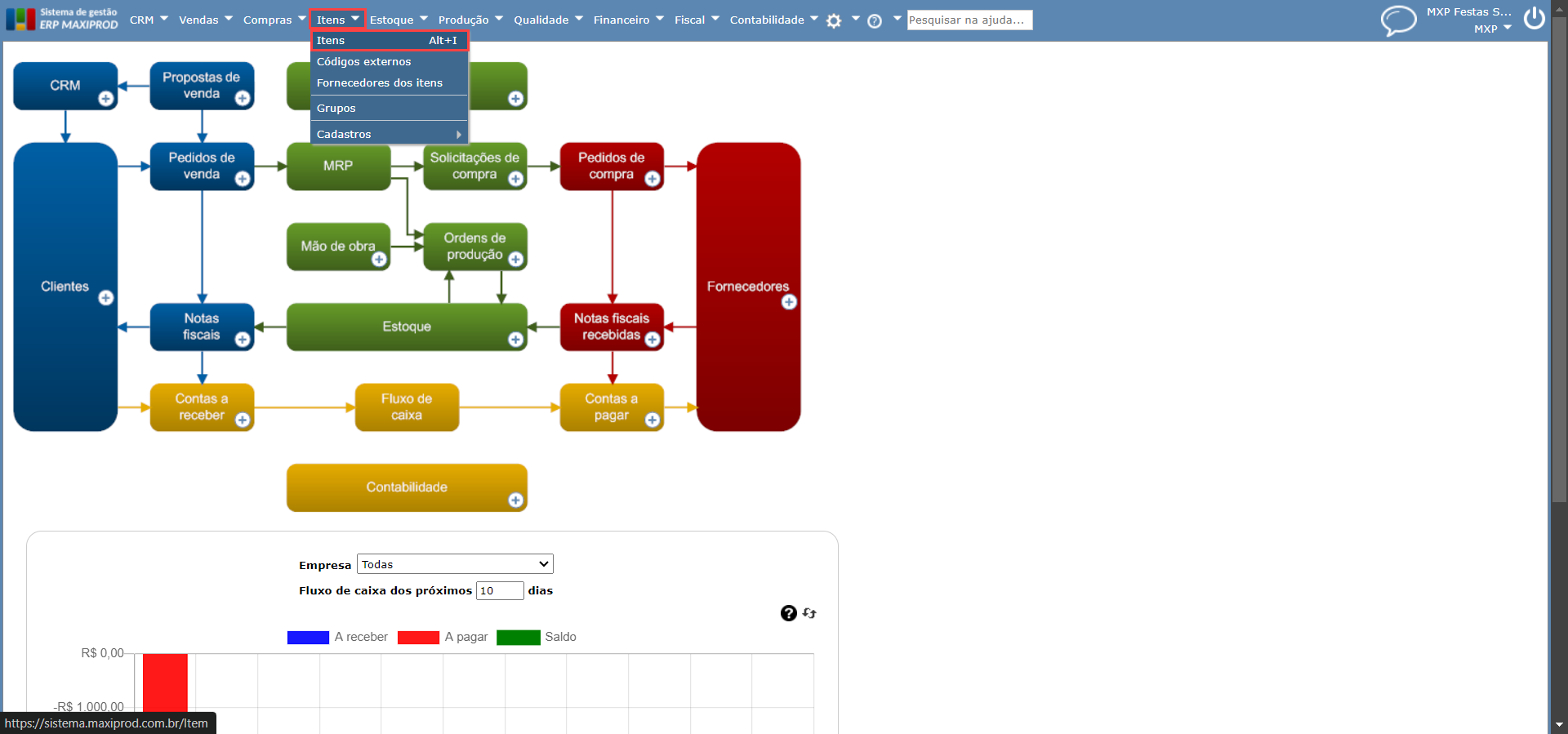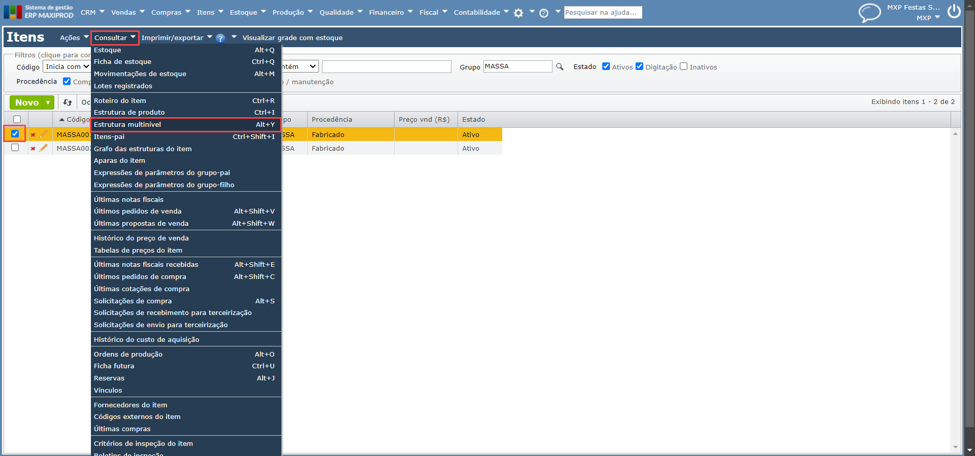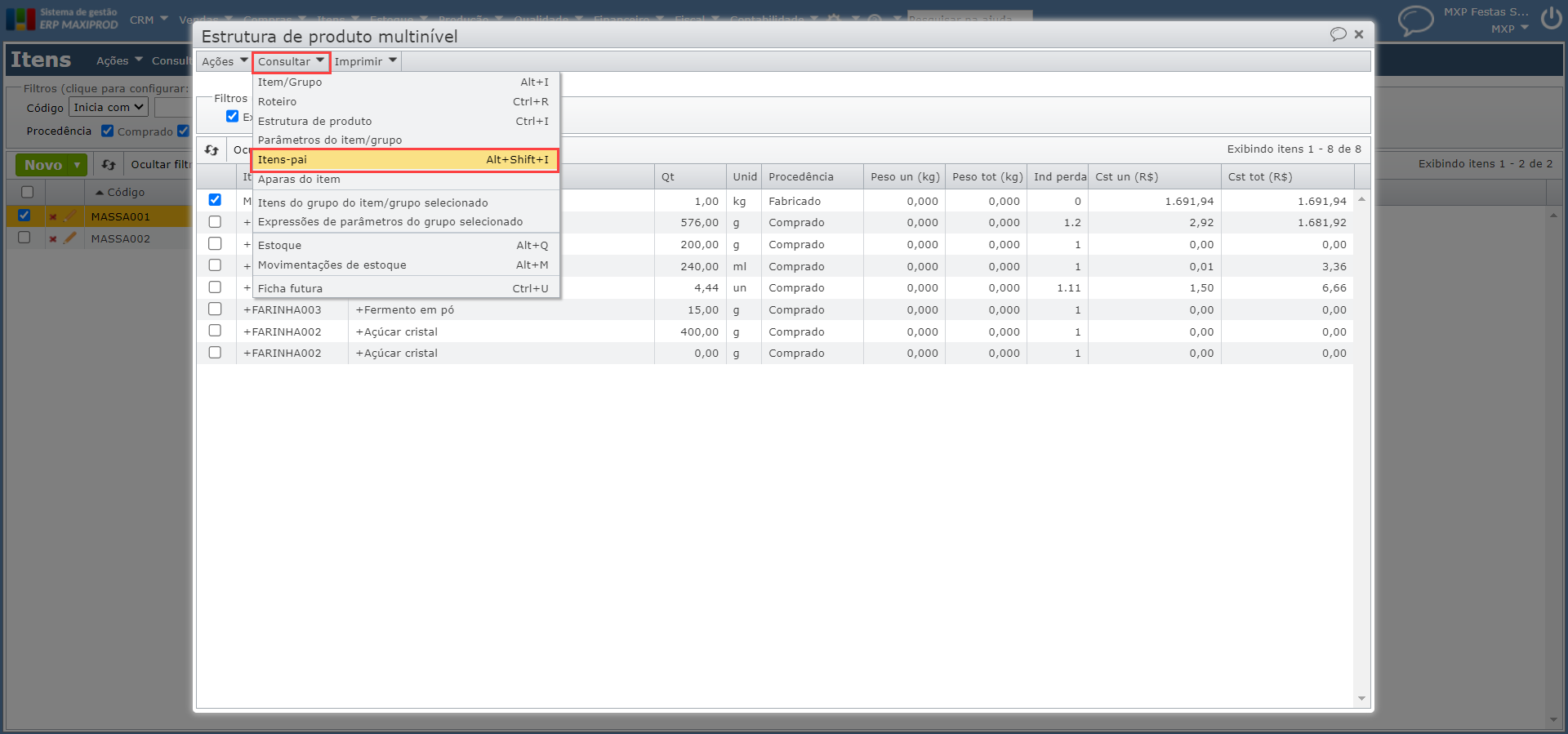A estrutura de um produto descreve os insumos, chamados de itens-filhos, necessários para a produção de um item-pai. No ERP MAXIPROD, é possível consultar os itens-pai de diferentes maneiras, utilizando várias telas do sistema. Dentre estas telas, podemos citar “Itens” e “Estrutura multinível“.