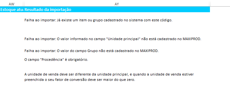 - Principais erros ao importar itens via Excel