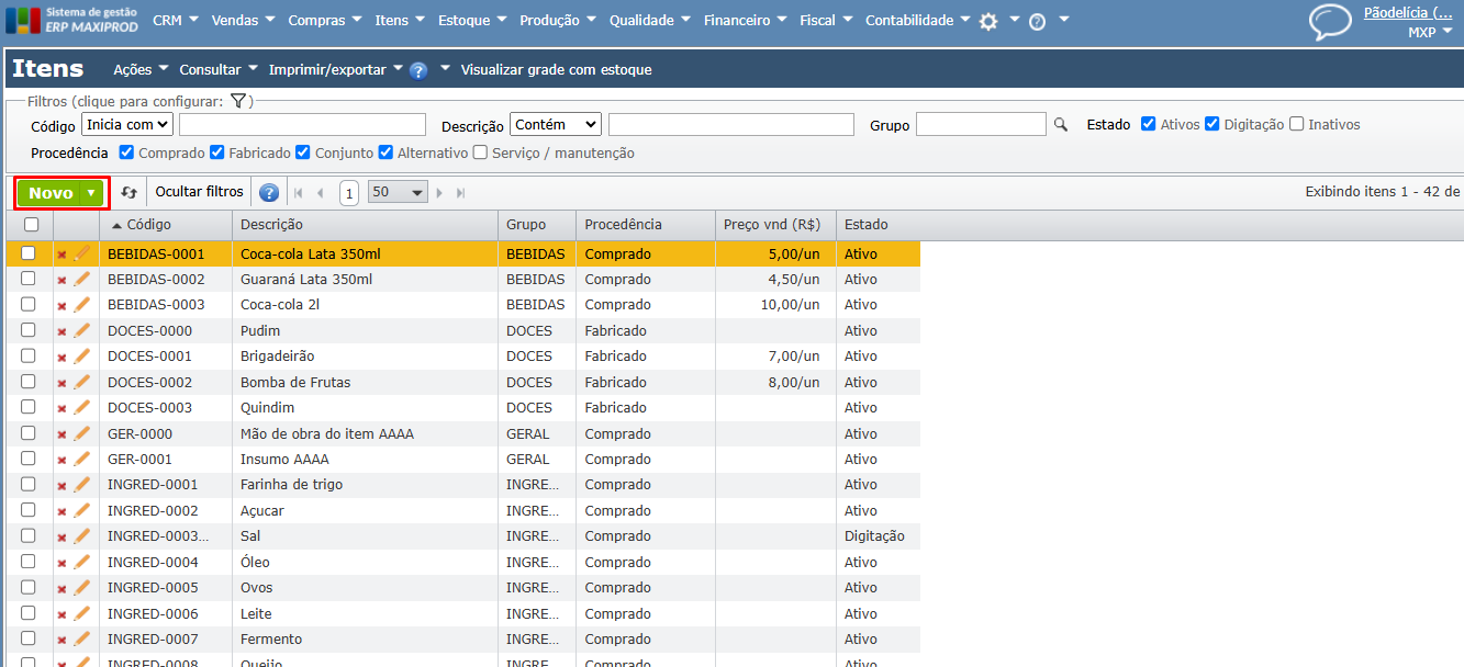 3) Acesse a grade de itens através do menu superior “Itens > Itens”. Clique no botão “atualizar” ao lado do botão verde “Novo” para carregar os itens na grade.
