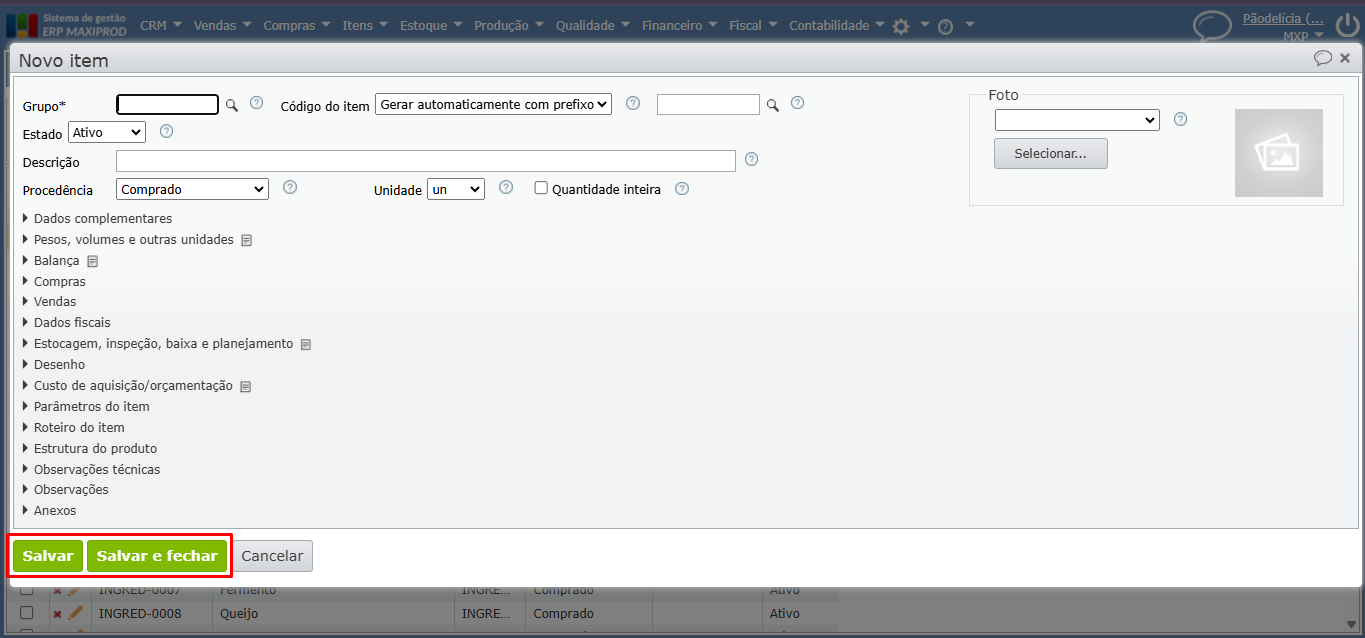 2) Clique no botão verde “Novo”. A tela de inserção de novo item se abrirá.