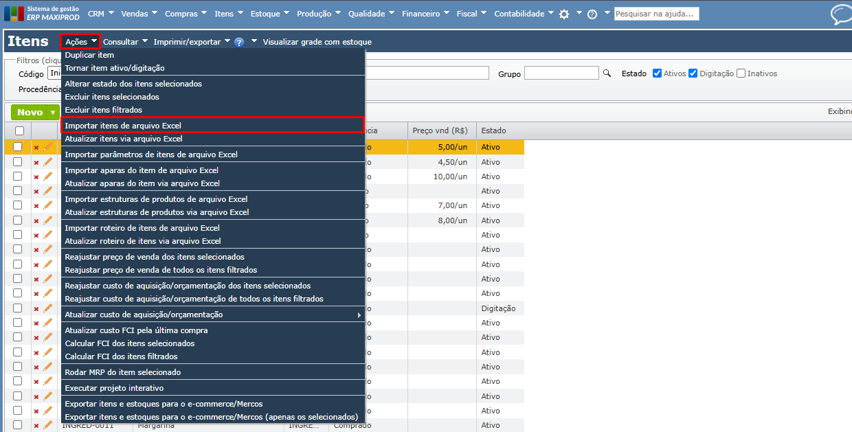 2) Clique no menu “Ações > Importar itens de arquivo Excel”.