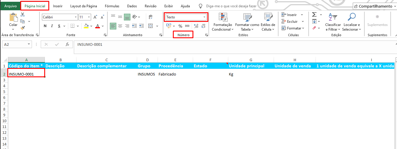 - Ao tentar atualizar itens, pode ser que o sistema não reconheça um código mesmo que ele esteja cadastrado. Neste caso, verifique se a célula do Excel é do tipo “Texto”. Selecione a célula, vá para “Página inicial > Número” e altere o tipo se necessário.