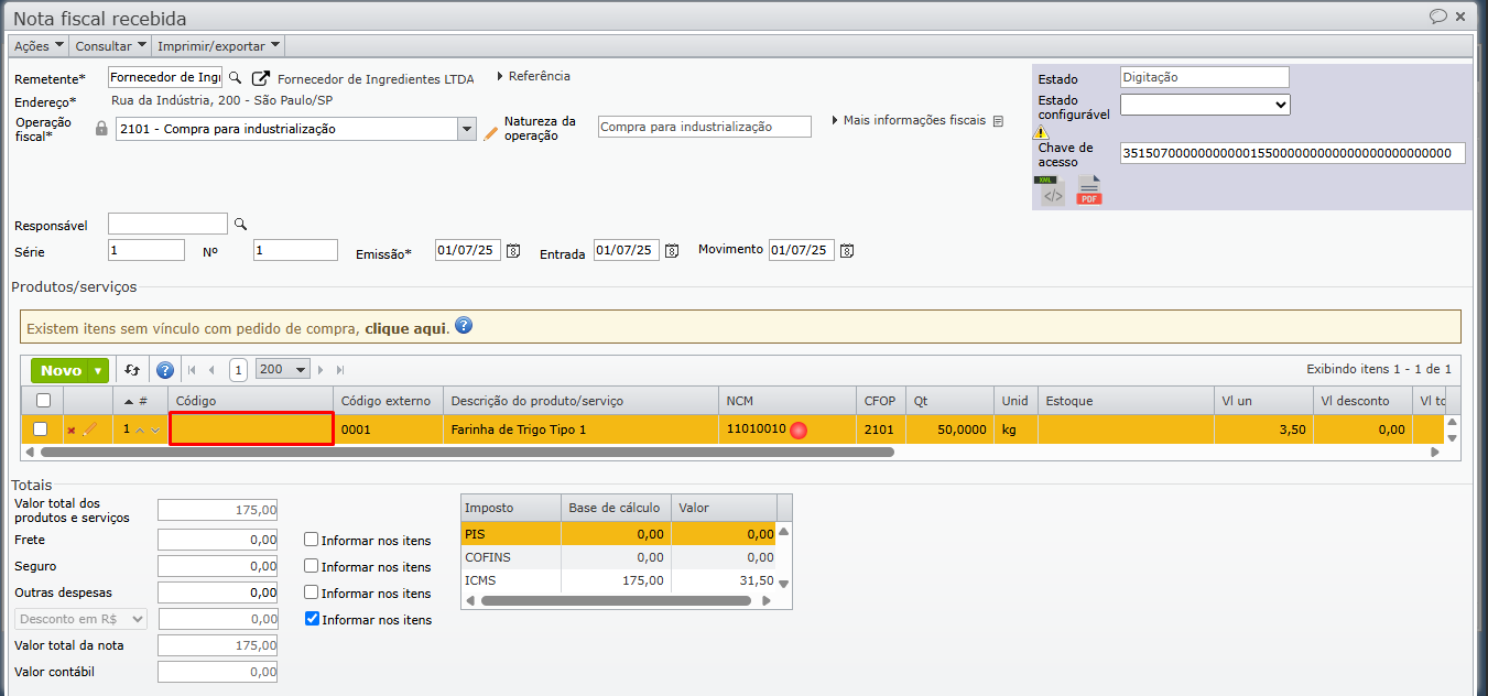 1) Após importar a nota através do XML, a coluna “Código”, na grade de itens estará vazia, pois estes itens não foram identificados e também não há referência aos seus códigos externos.
