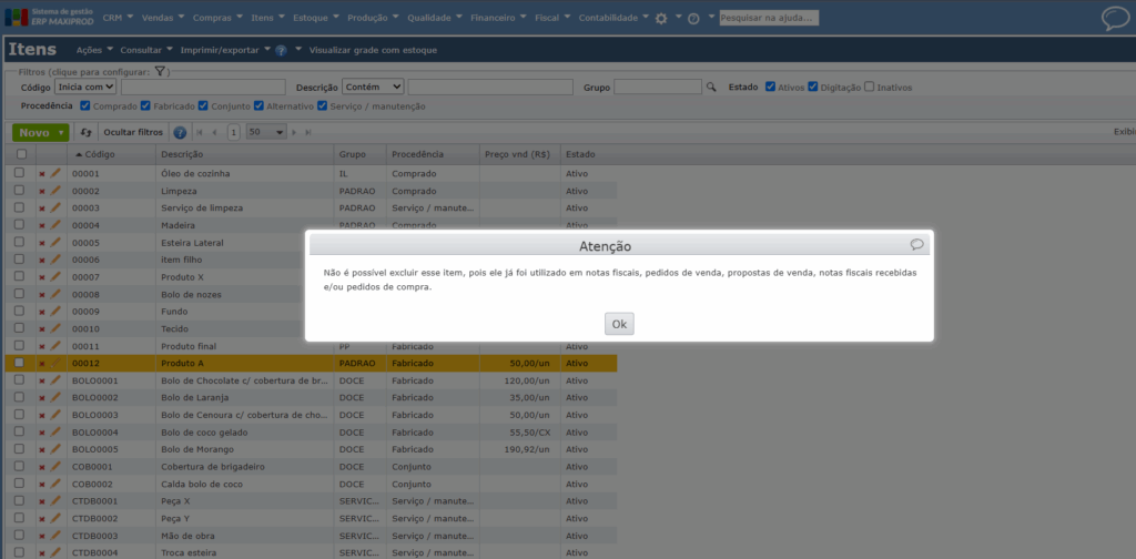 Atenção: um item pode ser excluído permanentemente do sistema somente se não tiver nenhuma movimentação (entradas, saídas, pedidos, ordens de produção, etc.) e não estiver vinculado a nenhuma outra operação (NF-e, cotação, SC, OP, etc.). Caso contrário o sistema irá apresentar uma mensagem informando que não é possível excluir o item, por exemplo: