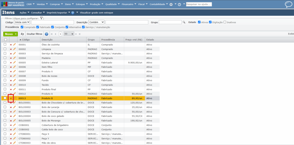 Às vezes, um item deixa de ser utilizado, o que não significa que ele deva ser removido do sistema, pois é necessário manter os históricos que referenciam este item. Neste caso, o item não deve ser excluído, apenas inativado. Para saber como inativar o item, veja o próximo tópico.