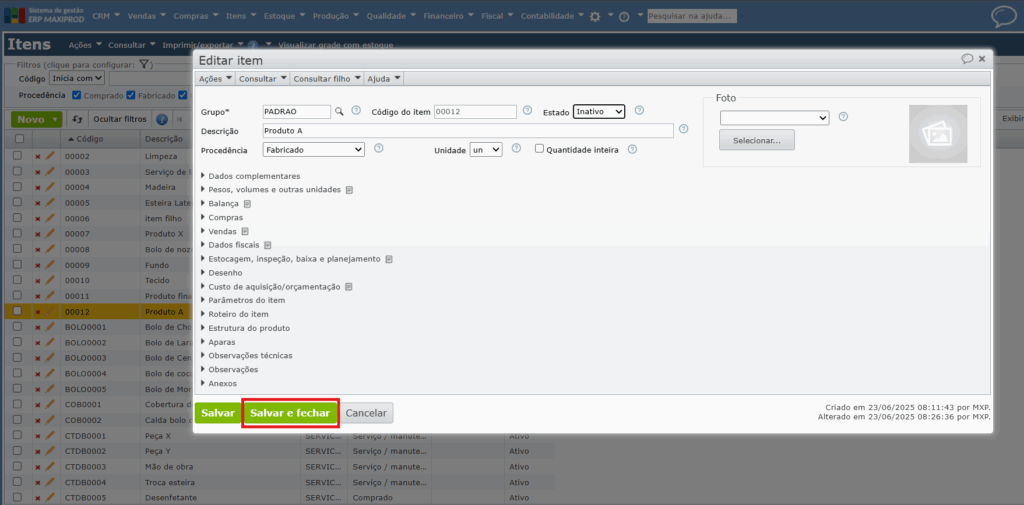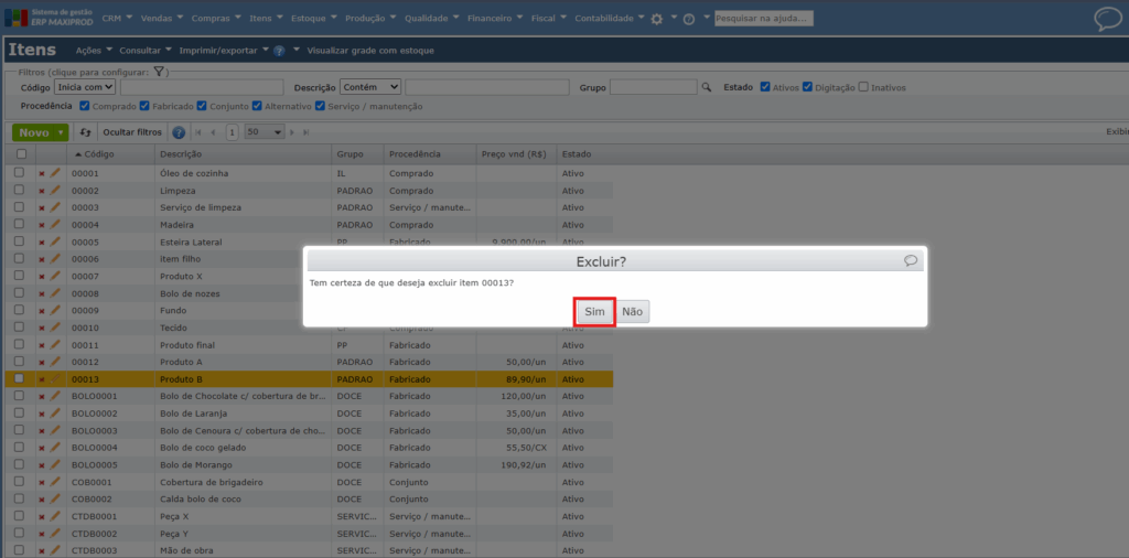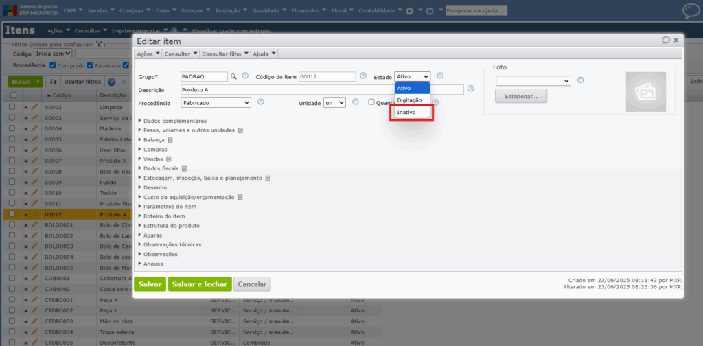 6) O item não será mais exibido por padrão nas janelas de seleção de itens, e nem na tela inicial de itens, mas permanece registrado no sistema. Assim, mantém-se o histórico do item e permite-se que seja reativado, se necessário.