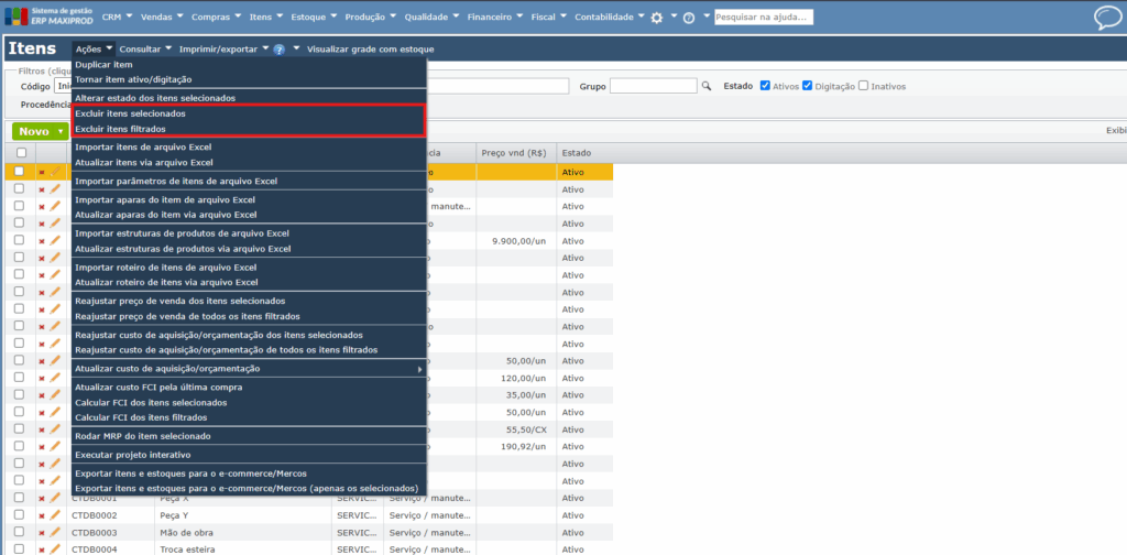 c) Também é possível excluir itens em massa, pelo menu “Ações> Excluir itens selecionados” para excluir os itens que tem as caixas de seleção marcadas, ou “Ações> Excluir itens filtrados” para excluir um conjunto de itens filtrados na tela.