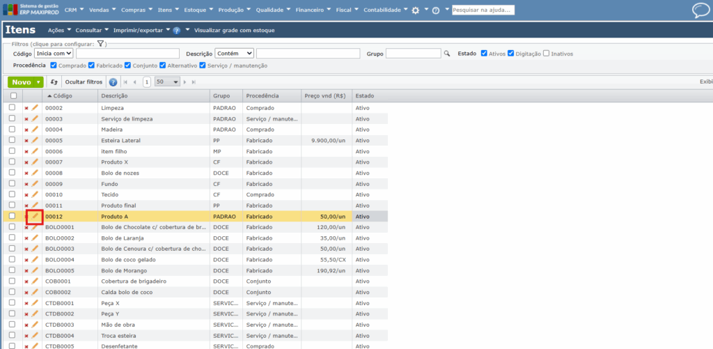 1) Para inativar um item, clique no ícone do “Lápis” na grade de itens para abrir a tela de edição do seu cadastro.