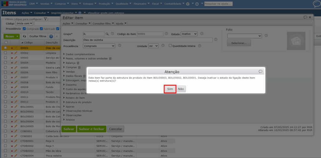 4) Se o item for utilizado em alguma estrutura de produto, o sistema apresentará uma mensagem informando e solicitando a confirmação.