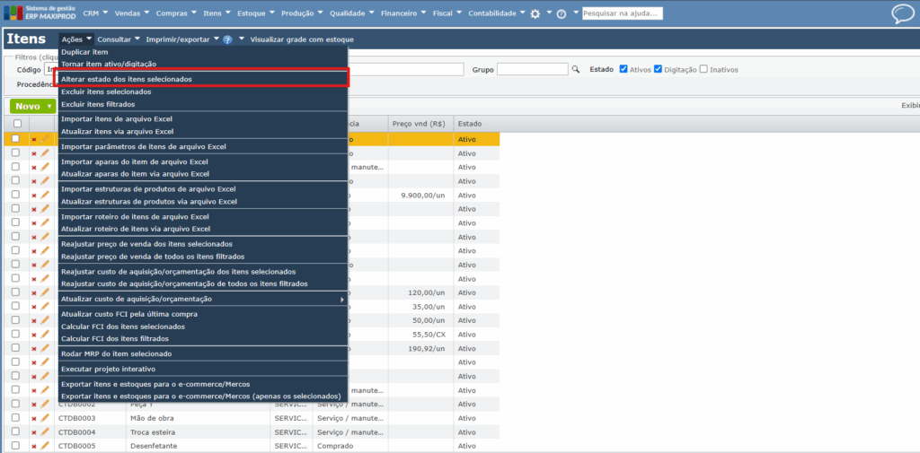 5) Também é possível inativar itens em massa, acessando o menu “Ações> Alterar estado dos itens selecionados” para inativar os itens com a caixa de seleção marcada.