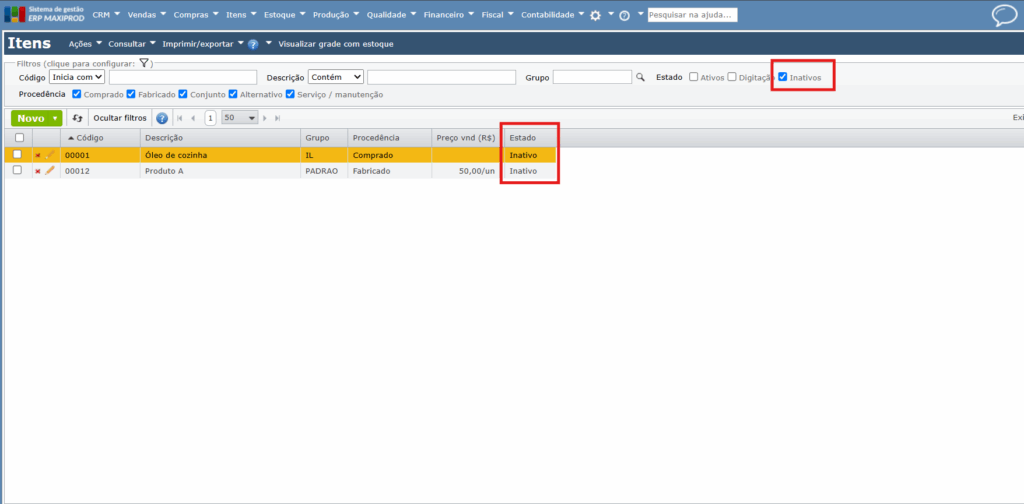 Atenção: o MRP não considera itens inativos.