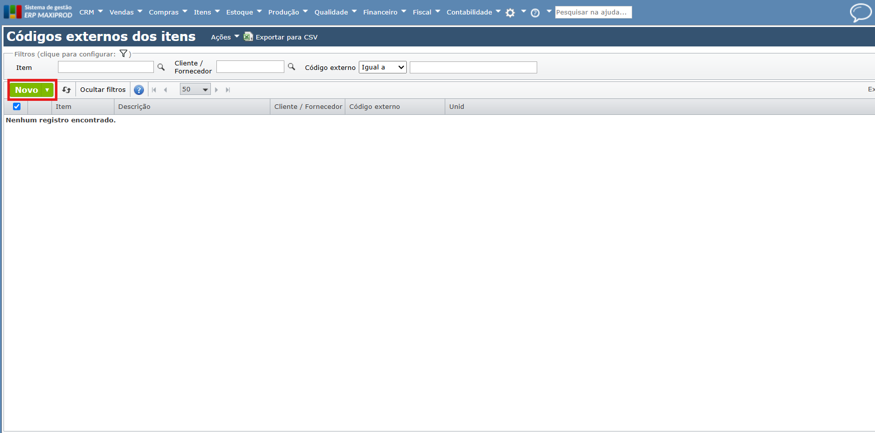 - Códigos internos: o ERP MAXIPROD gera códigos internos (SKUs) para os itens, que podem seguir um prefixo definido pela sua empresa.