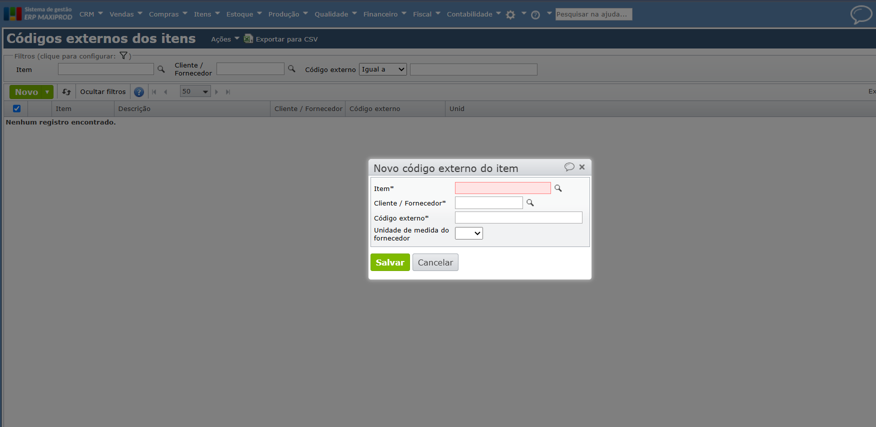 c) Preencha os campos “Cliente/Fornecedor” (a empresa externa), “Item” (código interno), “Código externo” (o código usado pela empresa externa para o mesmo item).