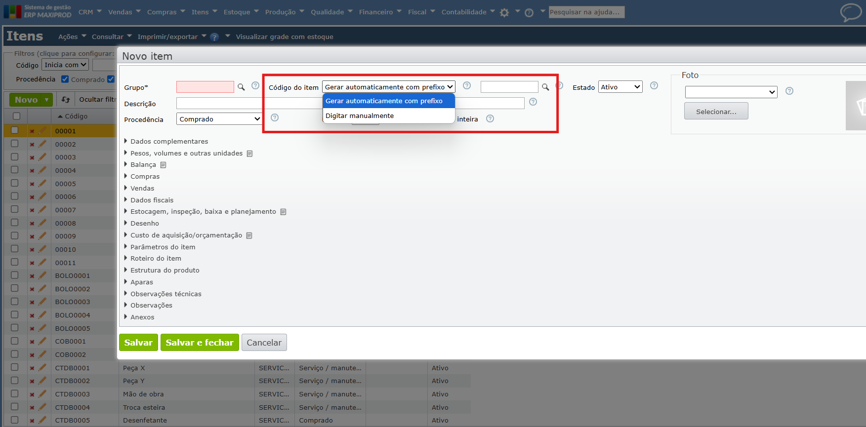 1) Campo “Código” do cadastro do item: único para cada item (não pode repetir). Pode ser gerado automaticamente através do prefixo indicado no grupo e inicializado no modal de cadastro do item ou digitado manualmente.