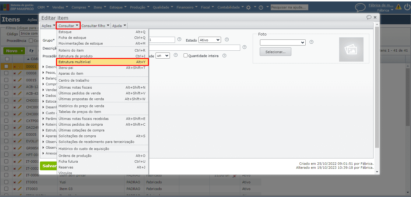 - A estrutura multinível pode ser acessada através da tela da edição do item, pelo menu “Consultar > Estrutura multinível” (Atalho ALT + Y).