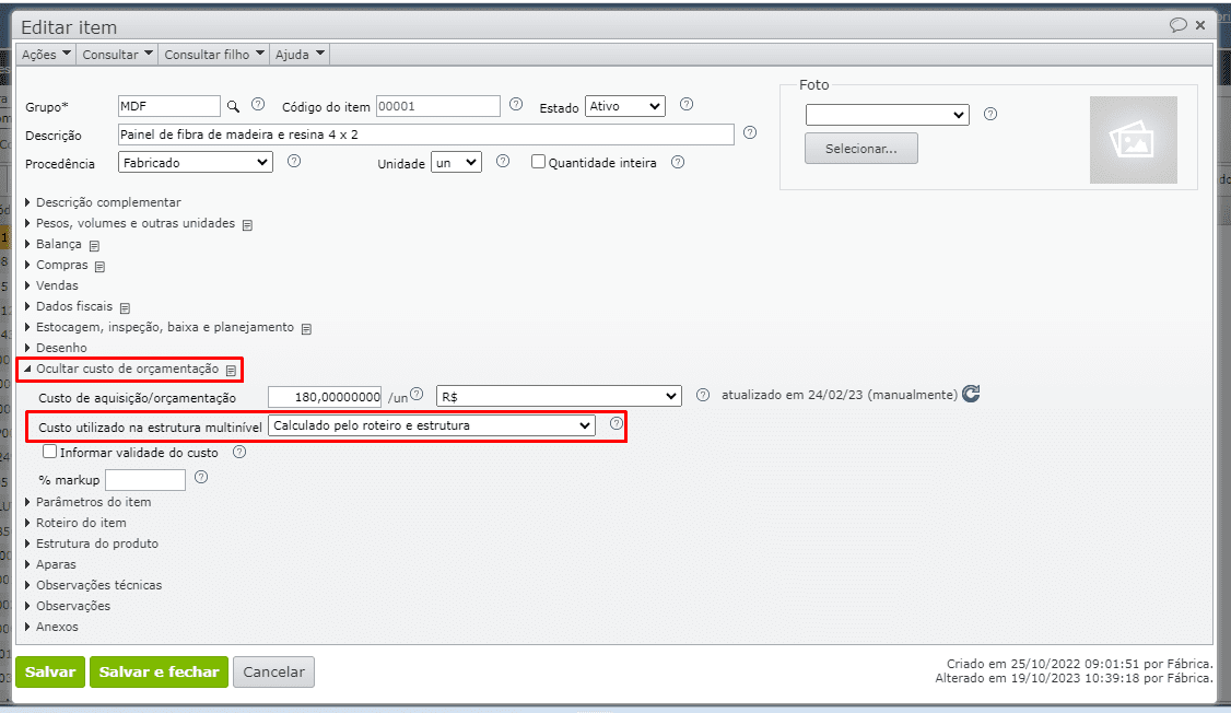 - Calculado pelo roteiro e estrutura: soma dos custos da estrutura multinível do produto (material) e do roteiro (mão de obra). Considera a quantidade de cada item presente na estrutura, multiplicada pelo seu custo orçado unitário, além de considerar o custo de mão-de-obra, se for sido informado o “Custo/h (R$)” no cadastro dos centros de trabalho das operações do roteiro do item.