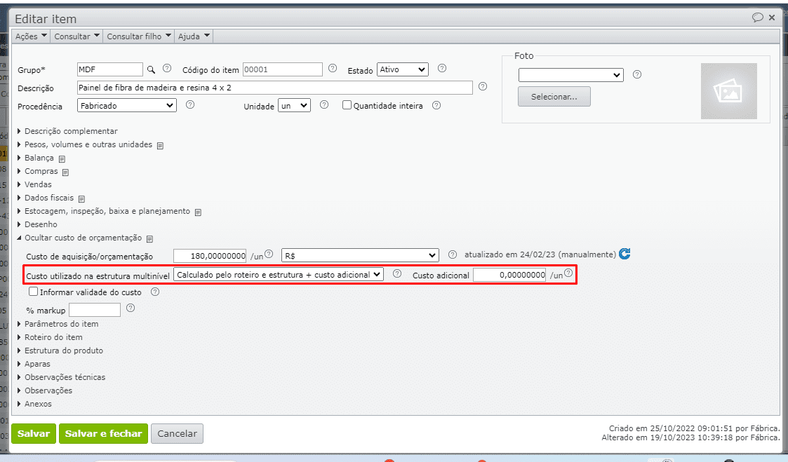 - Calculado pelo roteiro e estrutura + custo adicional: soma do custo de material da estrutura multinível do produto, da mão de obra do roteiro (da mesma forma que a primeira opção), porém, acrescentando o valor do campo “Custo adicional”.
