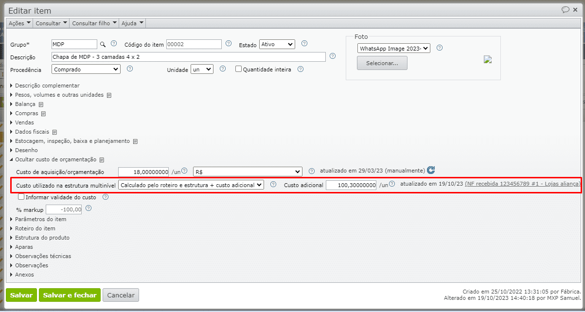 - Cadastro do item: valor informado no campo “Custo de aquisição/orçamentação”.