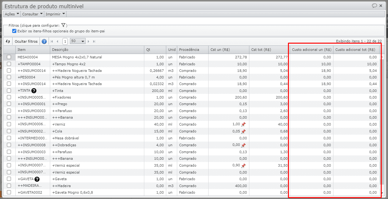 7) Na tela de estrutura multinível (“Consultar > estrutura multinível”) há duas colunas para o custo adicional do cadastro do item, são elas: “Custo adicional un (R$)” e “Custo adicional tot (R$)”. Estas colunas são inicializadas ocultas, por padrão. Para saber mais sobre como personalizar a visualização das telas, clique aqui.