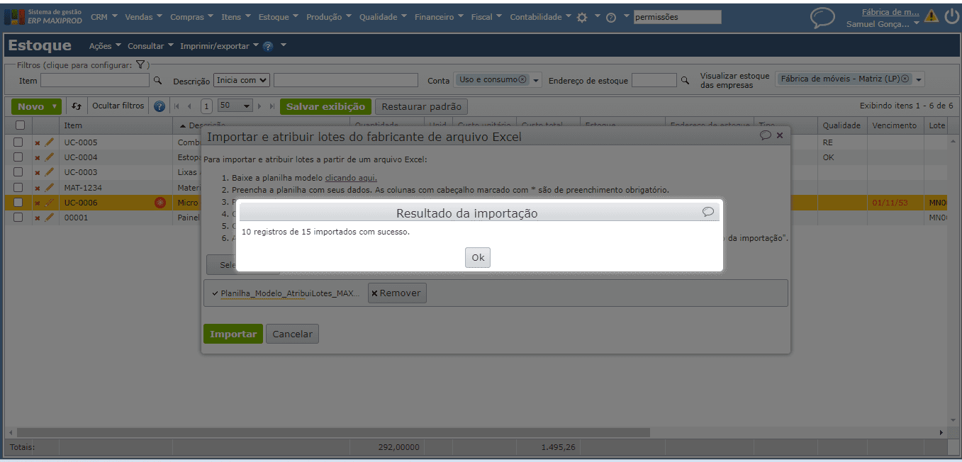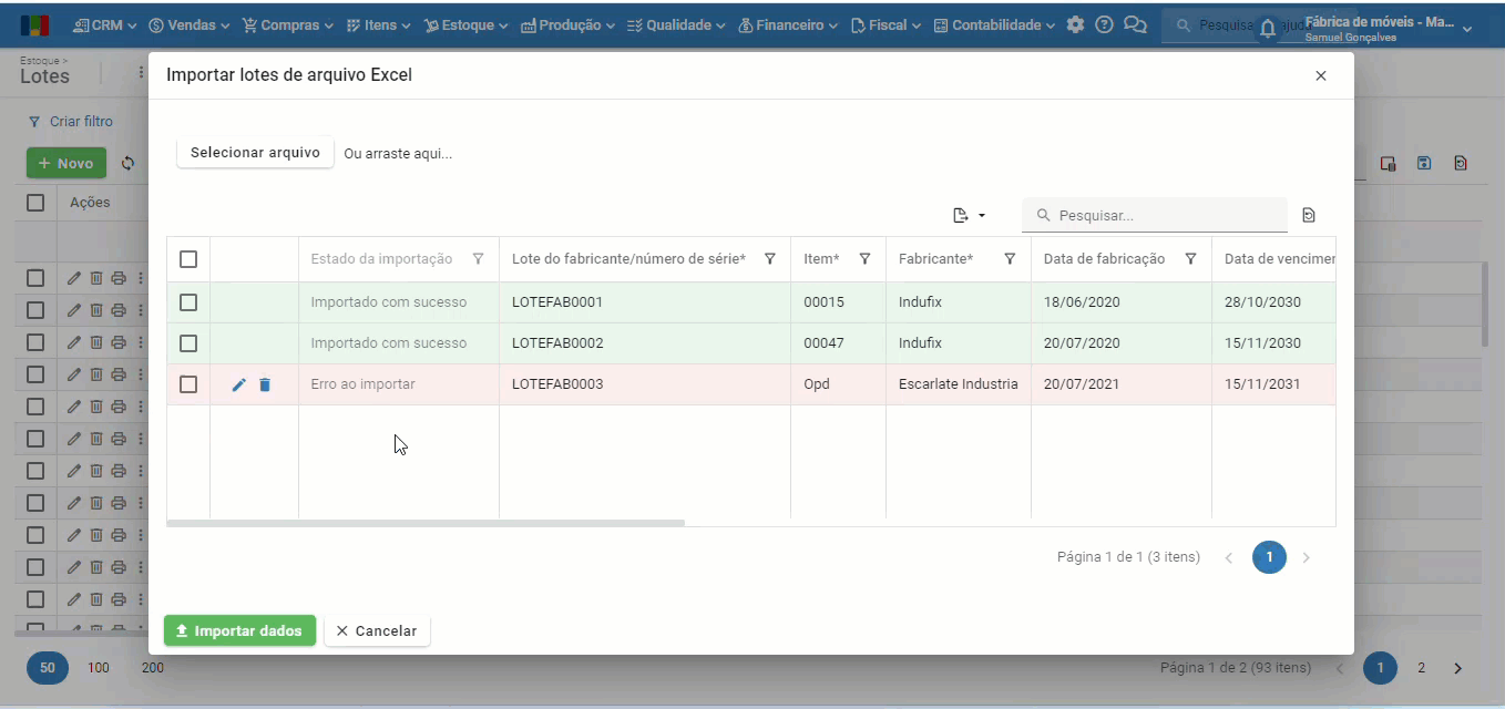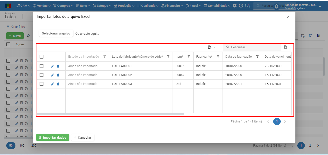 10) Os lotes, após importação, ficam disponíveis para atribuição aos registros de estoque.